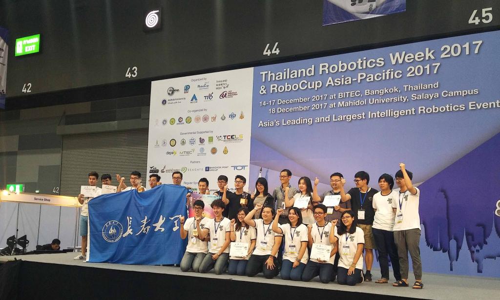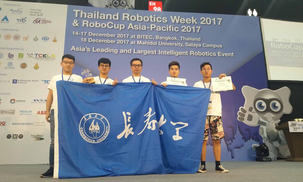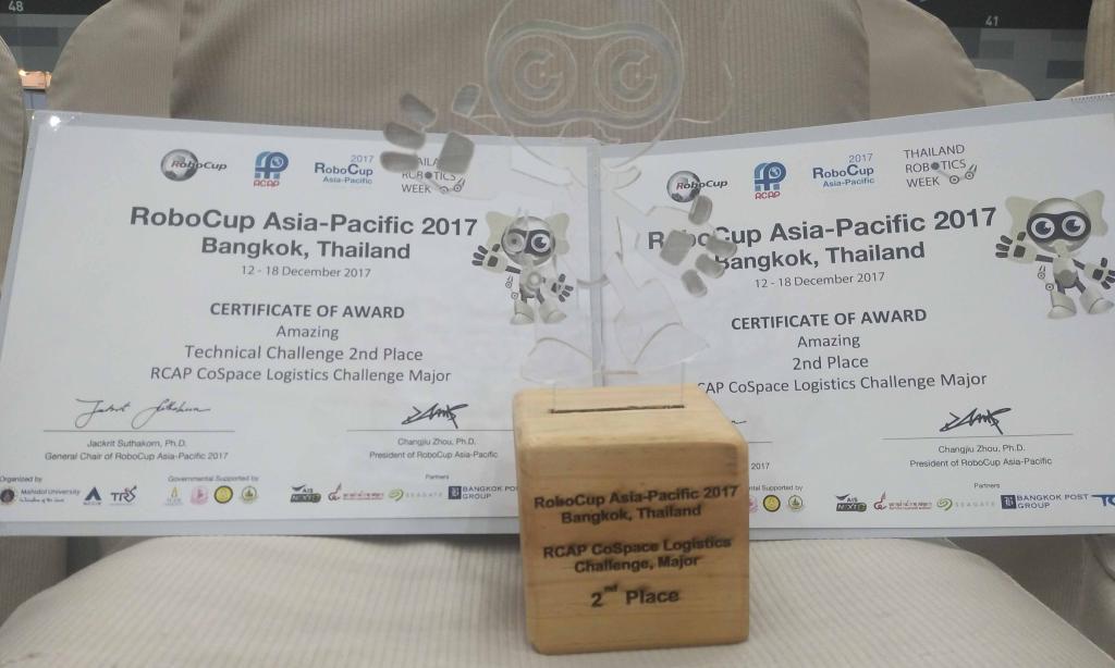 12月18日,2017首届亚太机器人世界杯大赛(RoboCup Asian-Pacific,RCAP 2017)在泰国曼谷落下帷幕,由我校电子信息工程学院教师徐大伟指导,学生于锁博、黄俊鹏、尹凯强、车健恺组成的参赛队伍“Amazing”,参加了大学组RCAP CoSpace物流挑战赛和RCAP CoSpace物流技能挑战赛两项赛事,经过三日共计六轮的紧张比赛,最终以每组总分第二名的成绩,斩获两项大赛亚军,为学校争得了荣誉。
