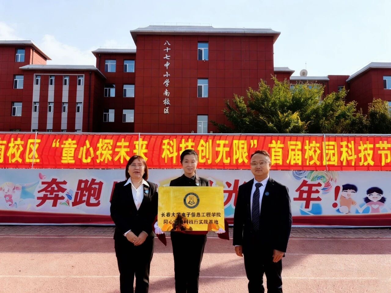 周秀晶校长和张立峰副书记共同为“长春大学电子信息工程学院同心青春科技行实践基地”揭牌。