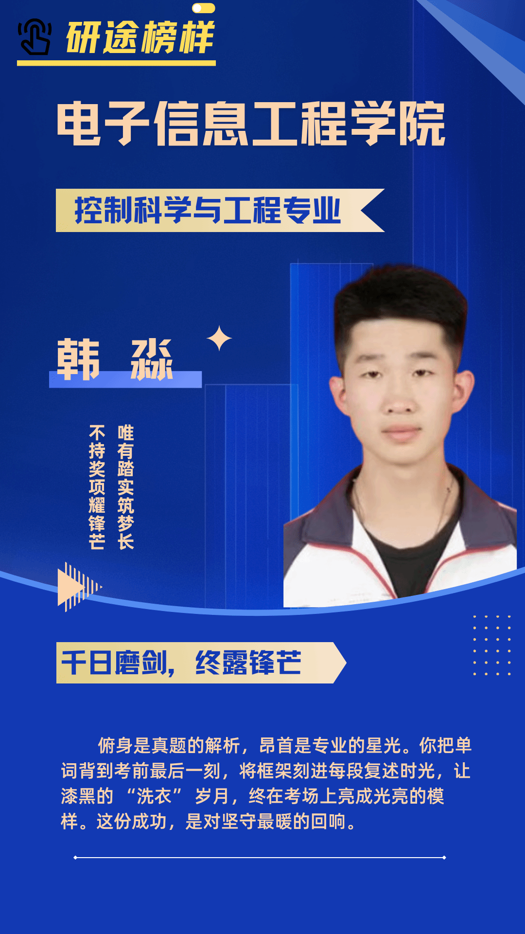 韩淼的本科四年虽没有耀眼奖项,却始终以“一步一个脚印”的态度对待学业,从认真听课到细致完成作业;同时参与学生工作与社会实践,在平凡中积累能力、沉淀心态,为考研 “持久战” 打下坚实基础。当别人犹豫时,他早已明确跨考目标,以 “长期主义” 稳步筹备。