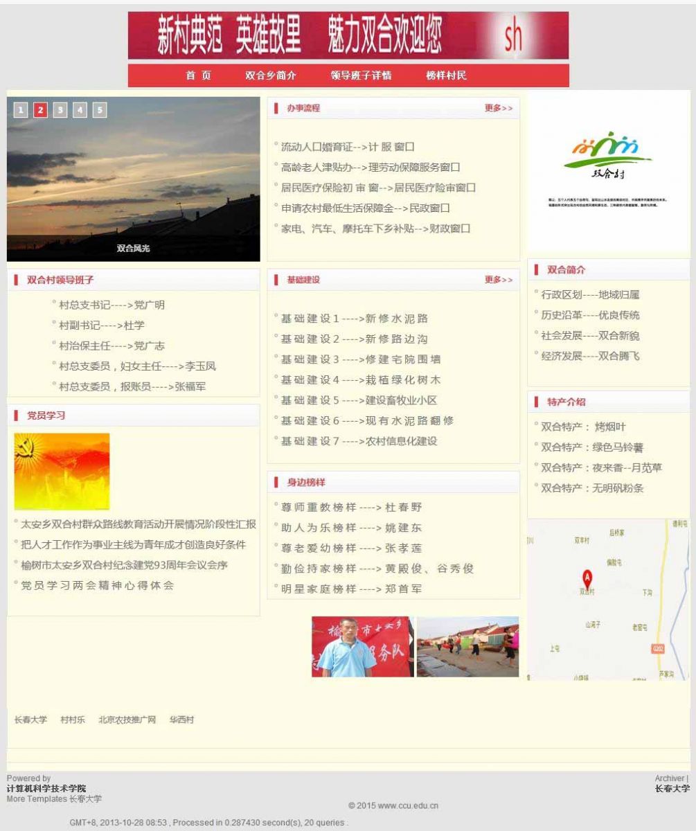 我校与榆树市太安乡双合村为文化、科技共建单位,联合申报的“弘扬团风精神 打造智慧乡村”项目为团省委重点扶持项目,自2014年7月以来帮助双合村建设了“团风”农民信息服务站,计算机科学技术学院志愿者利用周末和假期为广大村民开展家庭电脑使用常识培训、电子商务平台使用培训10余次,为更好的实现社会主义新农村建设的信息化、网络化,帮助村里制作了“英雄故里 魅力双合”网站,并可远程执行村务;管理学院志愿者为了让村里的特色农产品烤烟、月见草能够走出村里扩大市场,在淘宝网协助当地村民开设了首家双合村特色农产品网店为其构建了电子商务平台。2015年2月6日,音乐学院志愿者利用假期时间策划、编排与村民共同演出的“双合梦,长大情”迎新春庆丰收新年联欢会在村农机大库成功举办。改编歌曲《我们在双合相遇》娓娓道来长春大学与双合村科技、文化共建的情谊。根据村里烈士赵子龙创作的诗朗诵《双合英雄赞》,将整场晚会推向高潮,让在场的很多村民和志愿者都热泪盈眶,大学生们纷纷表示要向英雄学习,励志成才报效祖国。