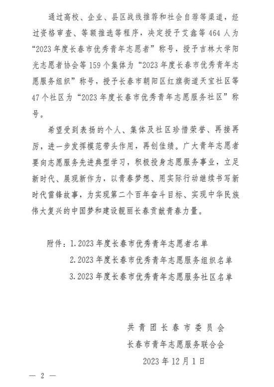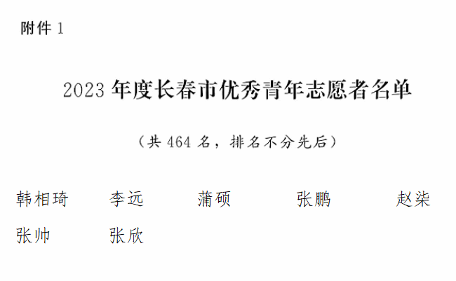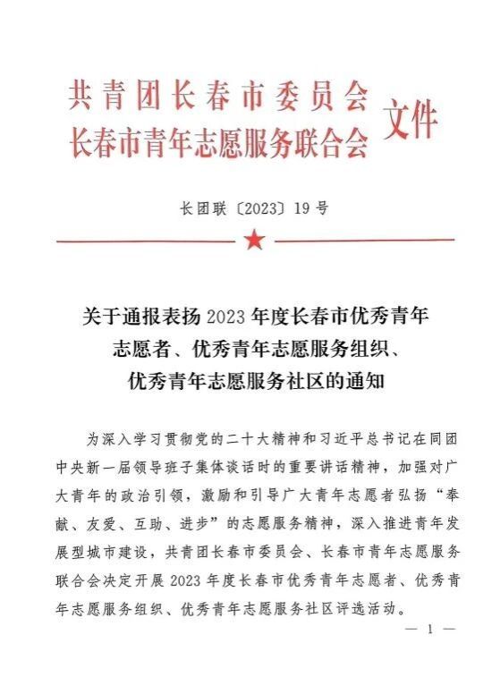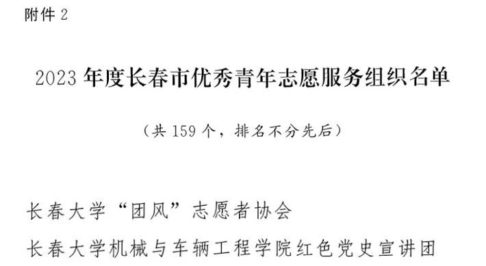 近日,共青团长春市委员会、长春市青年志愿服务联合会发布《关于通报表扬2023年度长春市优秀青年志愿者、优秀青年志愿服务组织、优秀青年志愿服务社区的通知》。经过广泛发动、校级遴选推报、市级评审等环节,我校韩相琦、李远、蒲硕、张鹏、赵柒、张帅、张欣荣获2023年度长春市“优秀青年志愿者”称号;“团风”志愿者协会、机械与车辆工程学院红色党史宣讲团荣获2023年度长春市“优秀青年志愿服务组织”称号。
