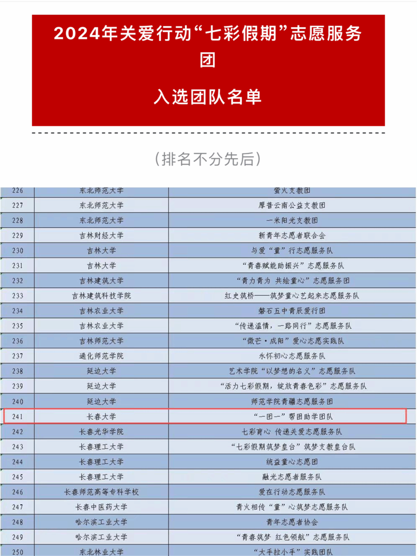 近日,由团中央青年志愿者行动指导中心、中国青年志愿者协会秘书处发布了《关于遴选2024年关爱行动“七彩假期”志愿服务团的公告》,我校外国语学院“一团一”帮困助学团队成功入选,全国1167所高校的6334支青年志愿服务团队提交申报材料,2000支大学生志愿服务团队入选。